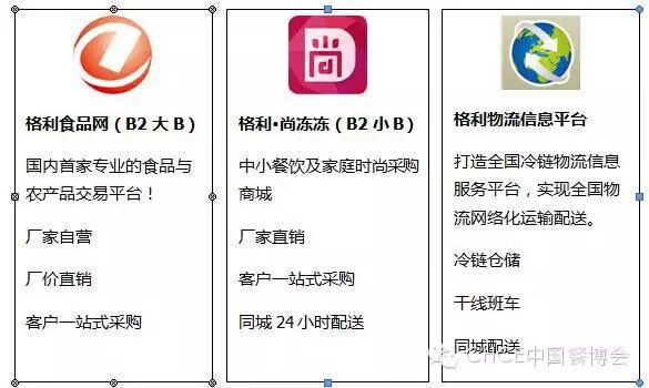 格利为上游厂家和下游用户提供现代化电子商务营销整体解决方案,格利集团旗下建设有覆盖大批交易的格利食品网平台,小批交易的格利尚冻冻商城,以及完成线下运输配送的物流信息平台。 以生产企业产品依托营销平台“抱团取暖式”集成营销方案,布局全国食材销售网点与交易服务点,“牵手”餐饮系统为战略目的,打造食品食材行业中最安全、专业、全面的互联网交易、交流平台,集产品展示、推广、交易,新品体验,行业展会交流,物流仓储服务,金融服务,食品科研信息服务为一体的综合性产业化互联网平台。