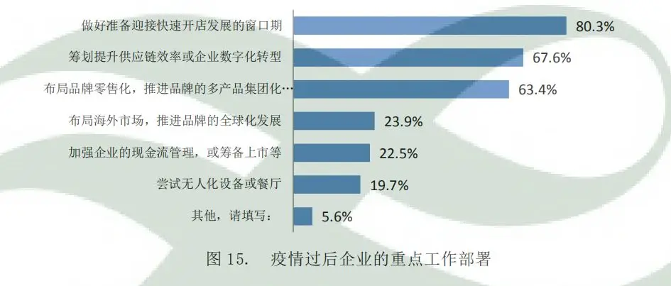 这次疫情对餐饮业改变很大,声称绝不做外卖的品牌开始做外卖;说着永不上市的品牌也改口称会考虑上市;也有向来只做堂食的品牌做起了半成品零售……从报告来看,80.3%受访餐企表示,疫情过后的首要工作是做好准备,迎接快速开店发展的窗口期;其次,67.6%受访餐企表示将筹划提升供应链或进行企业数字化转型;63.4%样本企业将布局品牌的零售化发展以及企业的集团化发展;22.5%受访餐企将重点加强现金流管理或筹备上市计划。