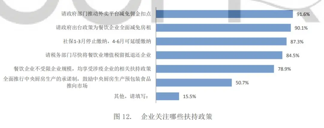 疫情爆发近一个月多月后,仍没有渡过难关的餐企有哪些核心诉求?最希望得到哪些政策扶持帮助?报告显示,91.6%的餐企当前最关注的问题是外卖平台减免佣金扣点,请求政府部门推动外卖平台减免佣金扣点成为他们的最大诉求。其次有90.1%餐企请求政府出台政策为餐饮企业减免房租;87.3%餐企希望政府出台社保相关政策,1-3月免缴,4-6月缓缴。