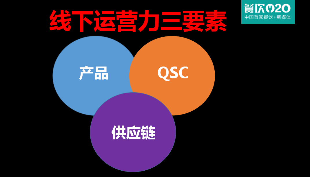 第一重能力是线下运营力,这个是基本功。不仅是指门店前台的运营,而是整个线下运营。主要有三大要素:产品、QSC精细化、供应链。