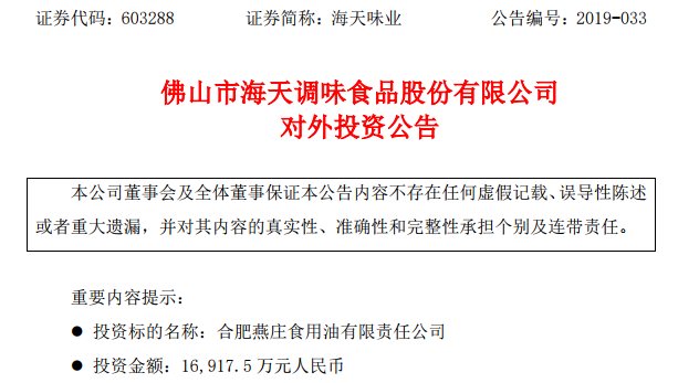 刚刚,佛山市海天调味食品股份有限公司(下称“海天味业”)发布公告称,根据经营发展需要,拟以 16917.5万元人民币的价格取得合肥燕庄食用油有限 公司(以下称“合肥燕庄”)67%的股权。
