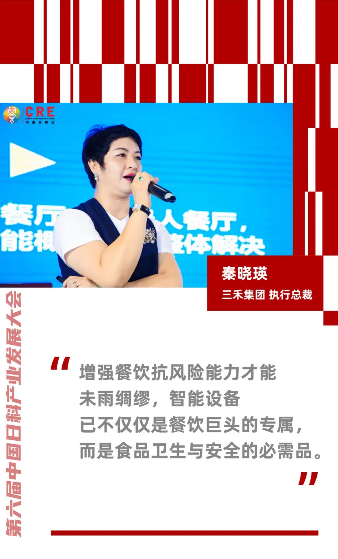 科技创新往往是一个产业进步的标志,三禾集团执行总裁秦晓瑛女士在现场分享了三禾最新的科技创新与应用的优秀案例,包括现在流行的无人餐厅、机器人餐厅以及全智能概念餐厅的整体解决方案等。她认为通过一体化产品应用和产品设计,未来的智慧餐饮模式将实现点单、后厨管理、出餐与体验的全程无人无接触。通过空间传送,只需要五分之一的用人成本将可以完成整个用餐的全部流程。