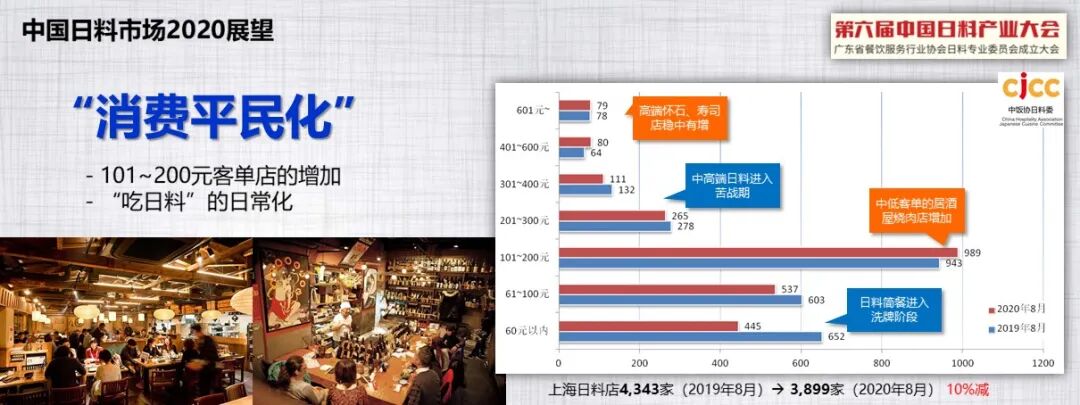 通过这些大数据的分析,他认为在不久的将来,日料市场将呈现氛围地道化、食材正宗化、消费平民化、菜品创新化、品牌连锁化和人才专业化六大趋势。