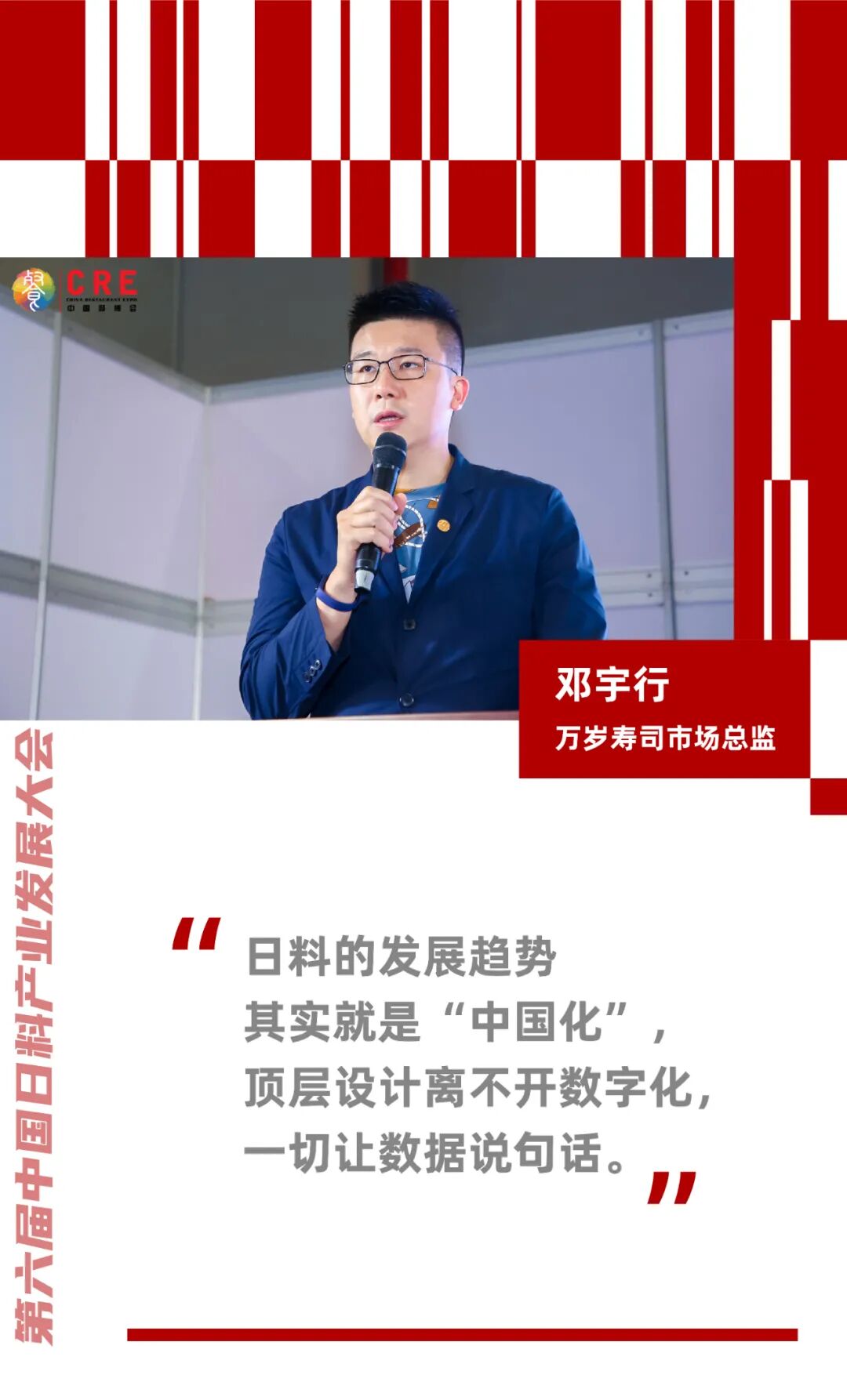 在解析日料未来的发展趋势时,万岁寿司市场总监邓宇行先生就以万岁寿司的经营方式为例,分享了先进技术给日料发展带来的优势。他认为日料的中国市场化发展一定要做到讯息共享化、原材料链条本地化、行业互联网化、行业整合化、操作数字化、品牌品类细分化、产品创新化和中国化。